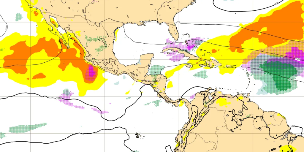 En Colombia se esperan aguaceros hacia las zonas del sureste y oeste de la nación acompañadas de tronadas intensas en horas de la tarde/noche mientras que en Venezuela los aguaceros podrían desarrollarse hacia las zonas del sur y sureste.