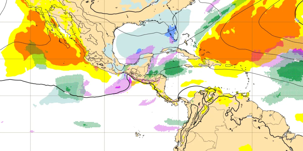 En centroamérica se esperan fuertes vientos así como temperaturas anormalmente frías debido a la masa de aire polar que se mueve sobre la zona especialmente para Nicaragua, Honduras, Guatemala, Belice y El Salvador. Para estas zonas (excluyendo El Salvador) altas probabilidades de aguaceros intensos, de hecho se esperan peligrosas lluvias en esa zona durante este lunes, especialmente Honduras.