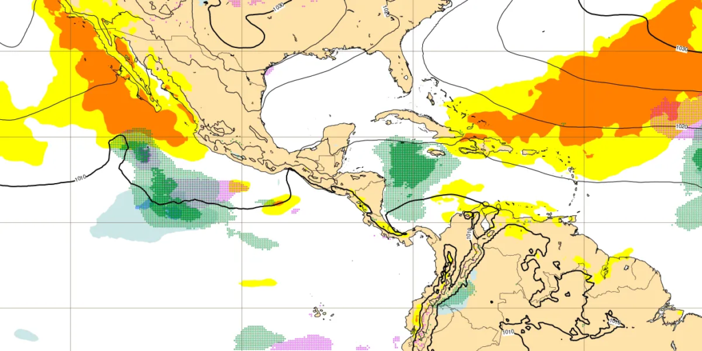 En centroamérica las mejores probabilidades de lluvias estarán hacia Costa Rica y Panamá así como las costas caribe de Nicaragua y Honduras. Las temperaturas estarán inusualmente cálidas para los países mencionados anteriormente. Para las demás regiones de centroamérica el tiempo debería estar relativamente bueno.